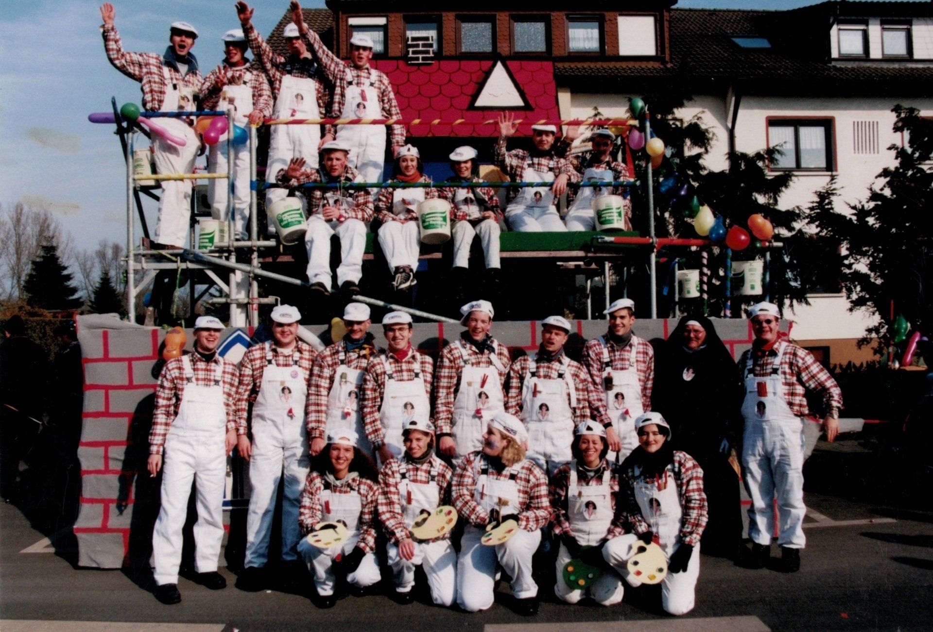 Im folgenden Jahr konnten wir dann einen Platz in der frisch bezogenen Heimatbundhalle ergattern und dort unseren Wagen bauen. Von 1999 bis 2006 waren wir mit einemWagen am Rosenmontagszug vertreten.